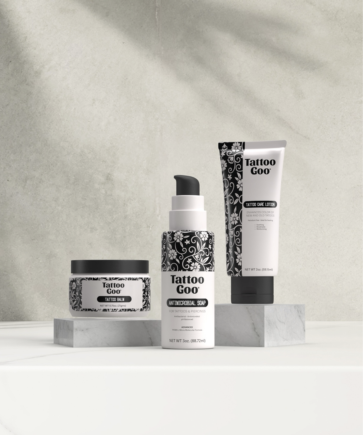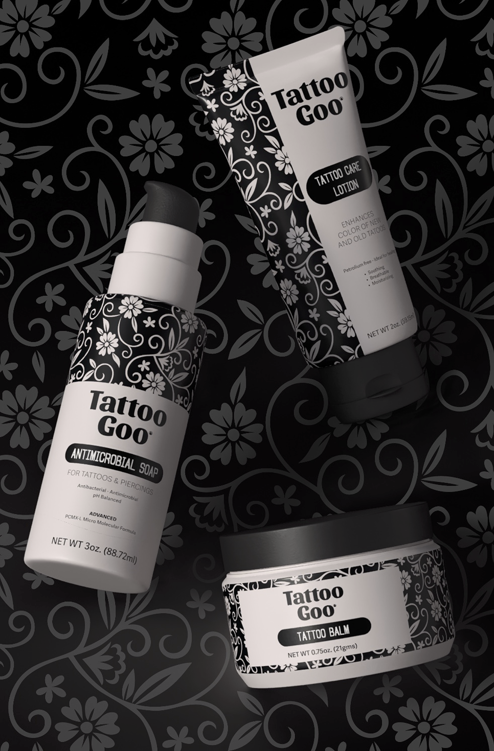 Tattoo Goo is a cosmetic packaging concept created to support tattoo aftercare through a bold, black-and-white design system. Applied across three distinct container shapes, each package balances form and function—one half wrapped in a tattoo-inspired pattern, the other presenting essential product details like ingredients, usage instructions, and medical disclaimers. The contrast highlights the artistry of tattoos while ensuring clarity and accessibility for the user. The result is a clean, cohesive system that celebrates tattoo culture while promoting safe, informed aftercare.
